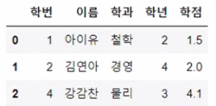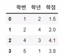 data2 = {'학생학번': [1, 2, 4, 5],
