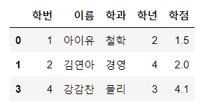 data1 = {'학번': [1, 2, 3, 4],