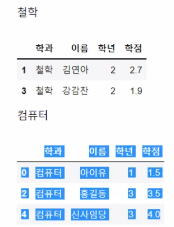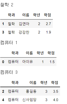 # display(group) - 각 학과의 DataFrame 내용들이 나온다