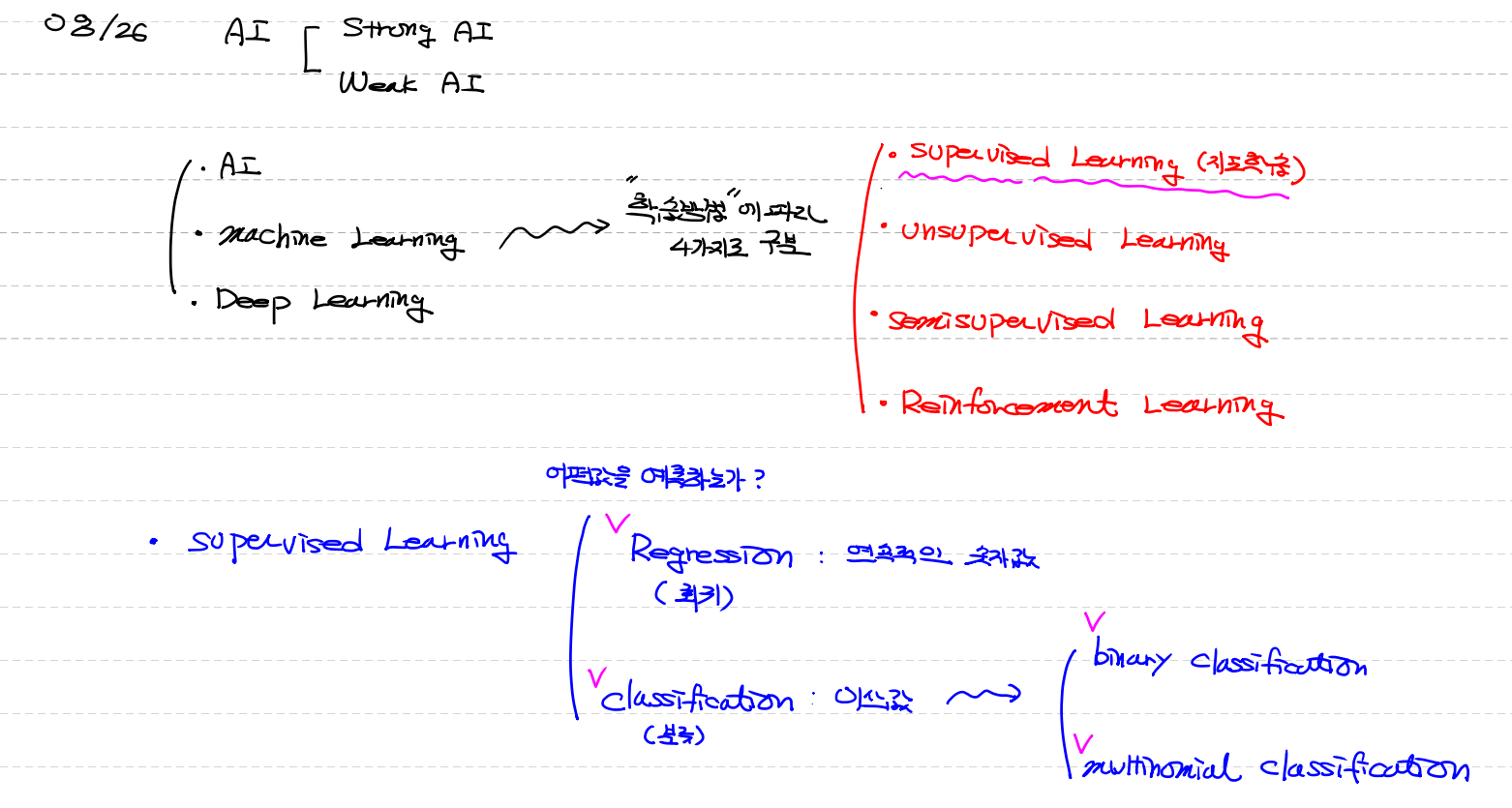 지도학습(supervised learning)은 모델 완성 후 어떤 종류의 예측하느냐에 따라