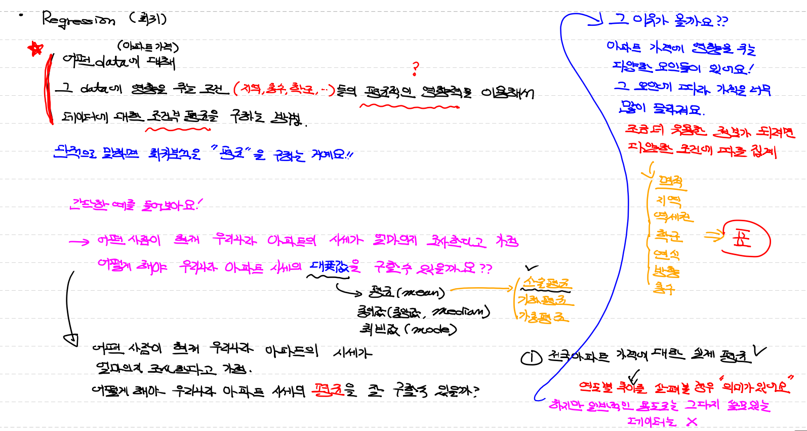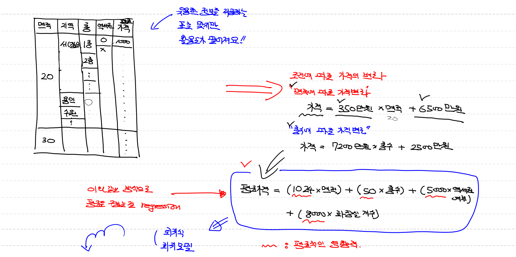 어떤 data에 대해 그 data(아파트가격)에 영향을 주는 조건(지역,층수,학군..)들의 평균적인 영향력을 이용해서