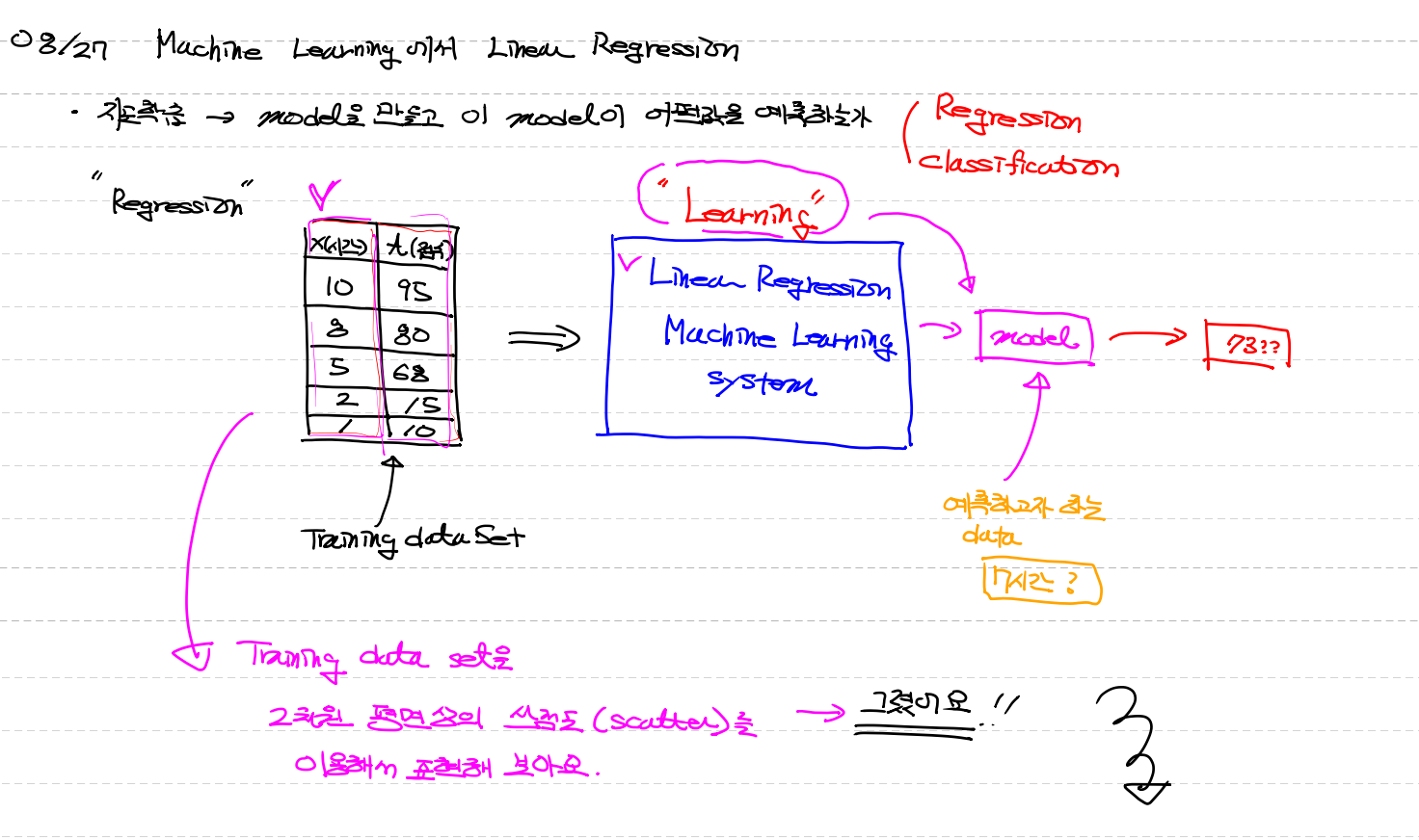 # plt.plot(df['공부시간(x)'],df['공부시간(x)']*4 - 10, color='magenta')