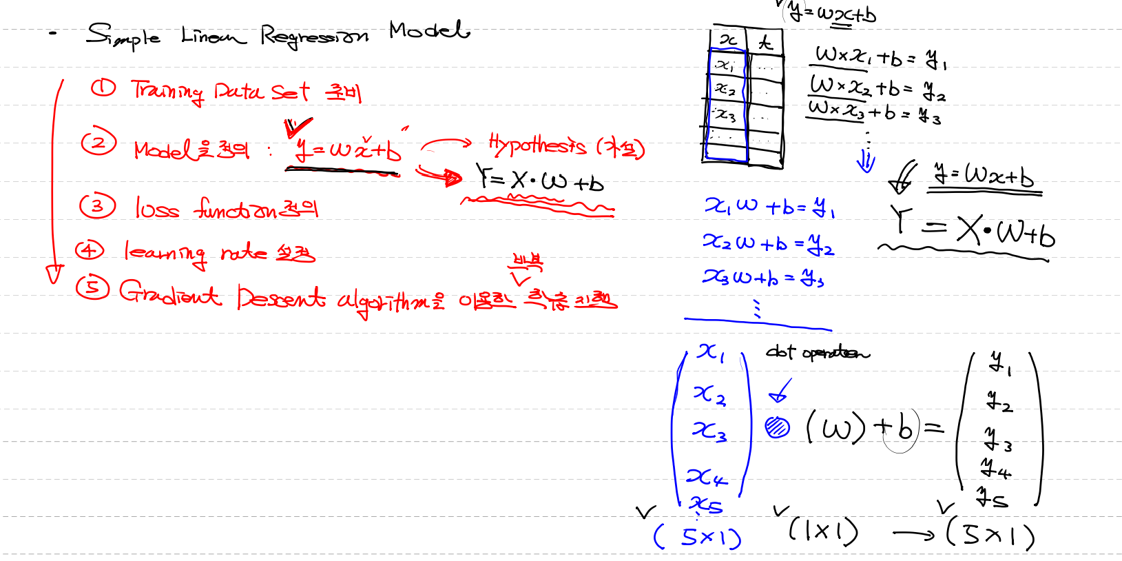model을 정의 : y = Wx + b(1차원) => X ` W + b
