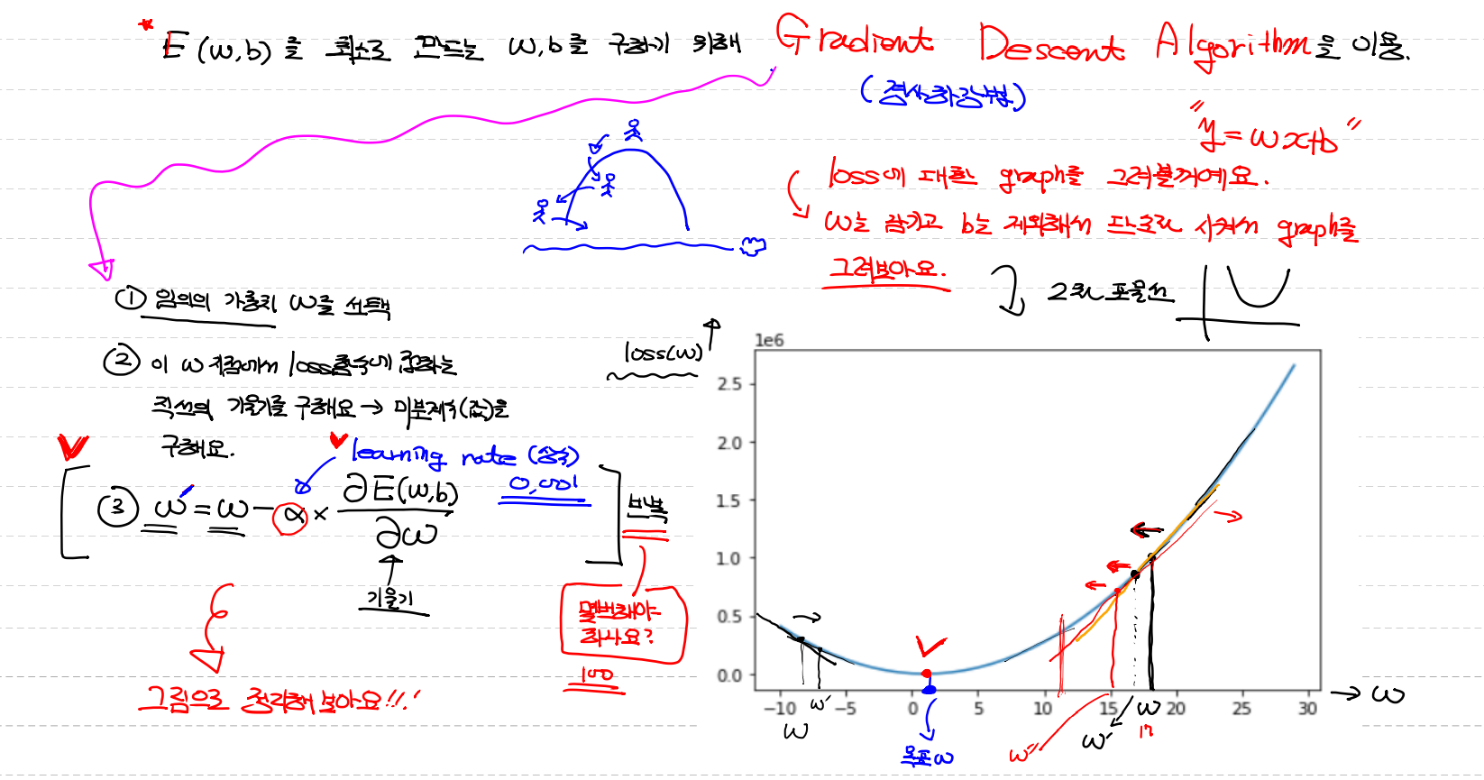 2.임의의 w지점에서 loss함수에 접하는 접하는 직선의 기울기를 구해요 → 미분계수 (값)을 구해요