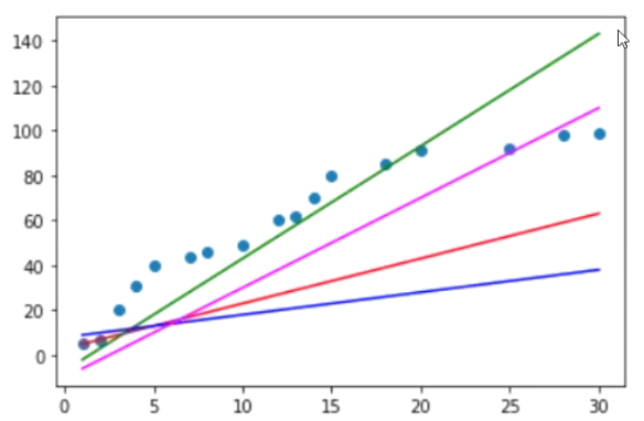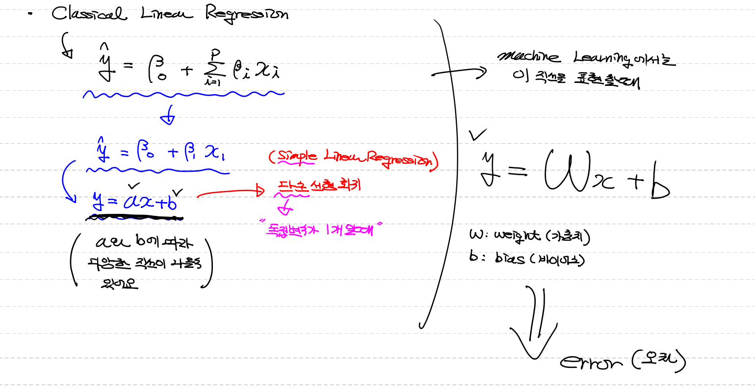 y = ax (기울기) + b(절편 : y축과 만나는 점) (독립변수1개)를 좁혀가면서 찾아가는 학습 → Simple Lineal Regression(단순선형회기)