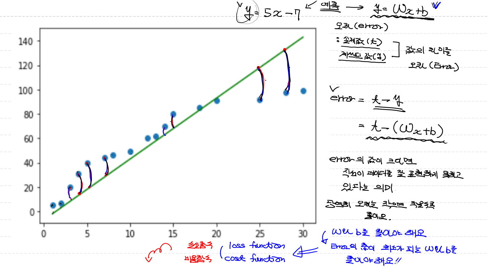 실제값(t) - 점 , 계산된값(y) - [5x -7 ] 의 차이를 오차