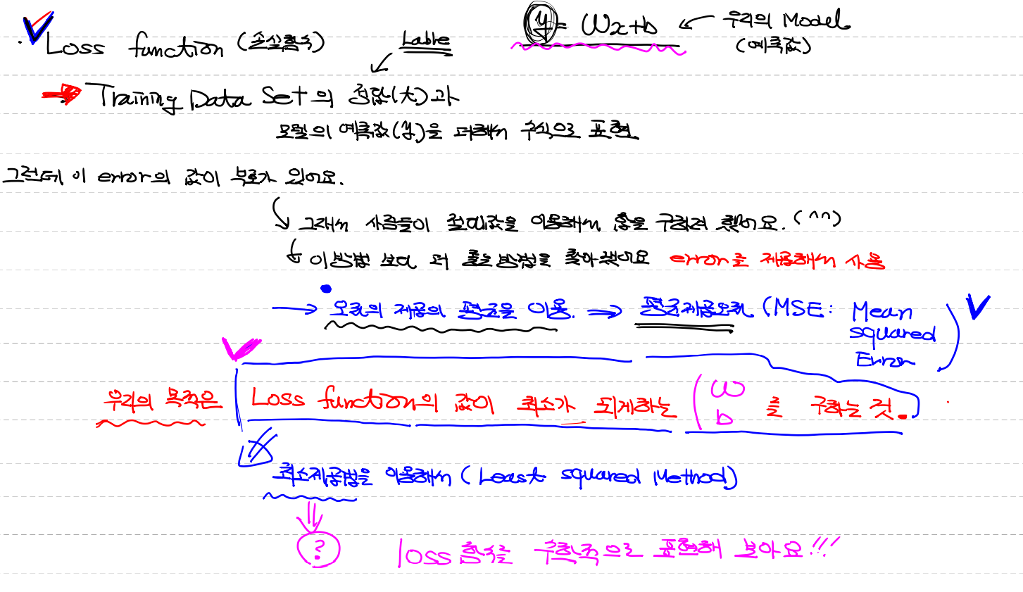 => 우리의 목적은 loss 함수를 최소로 하는 W,b를 구해서 model을 완성하기 위해서 알고리즘 이용