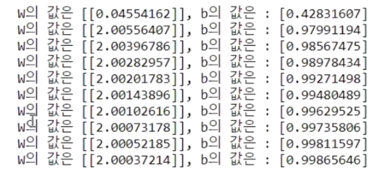 print('W의 값은 {}, b의 값은 : {}'.format(W,b))