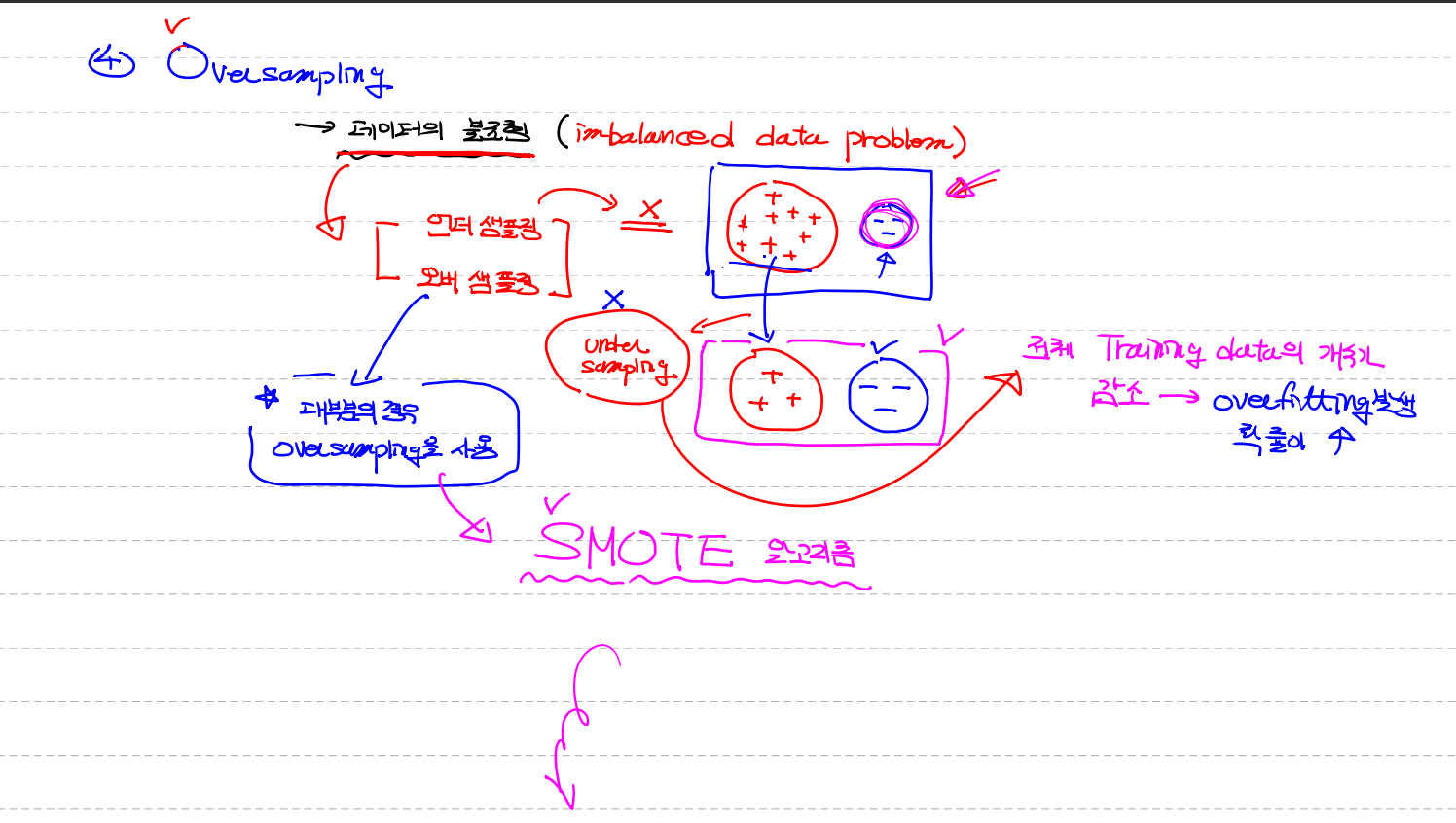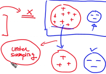 under sampling - 적은data 기준으로 많은 data 에서 뽑아서 맞춘다 하지만 Training data크기가 줄어드는 문제점이 있다. 즉 다시 overfitting의 문제가 발생해 거의 사용하지 않는다