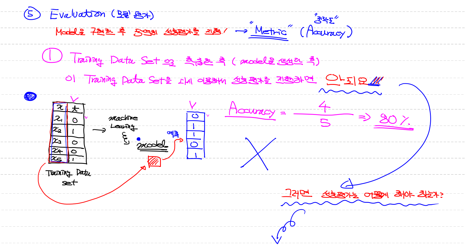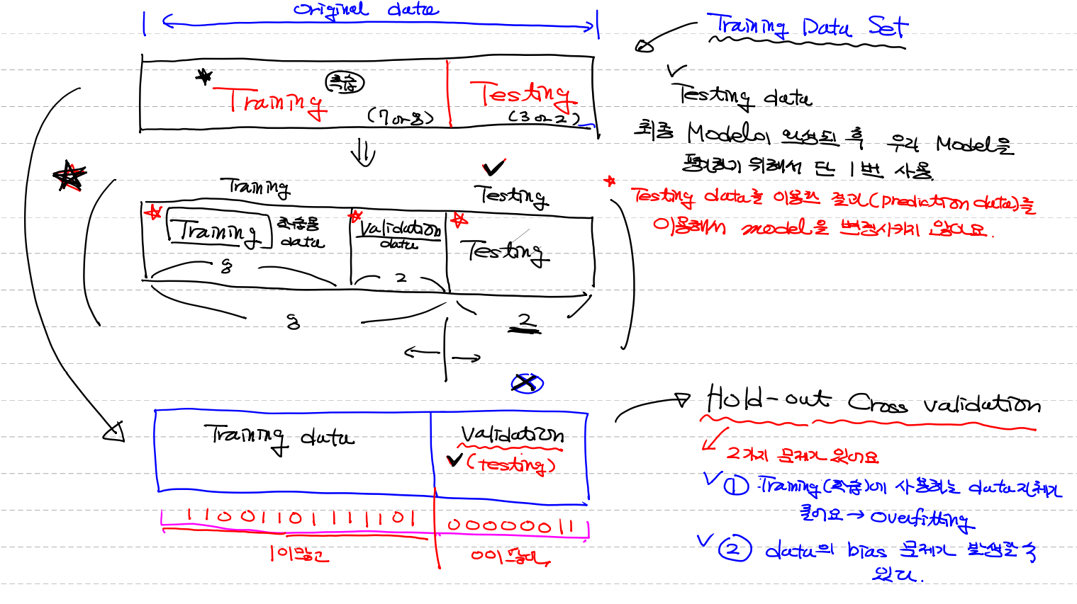 - Testing data를 이용한 결과(prediction data)를 이용해서 model을 변경시키지 않아요