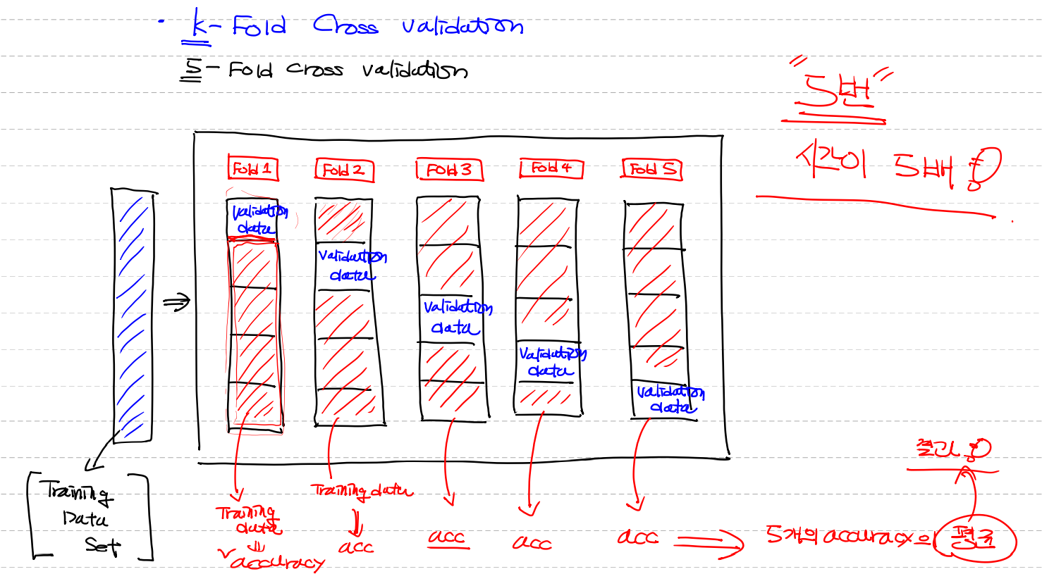 2. Fold 5개를 5등분해서 각자다른위치에 Validation data를 넣는다 (위사진 참고)
