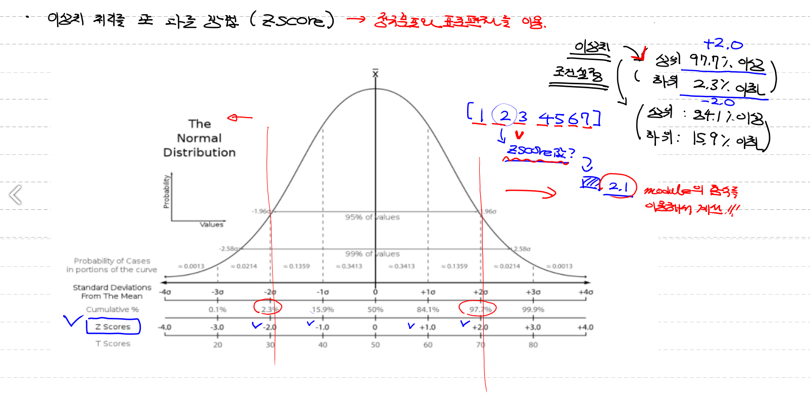 - data들을 정규분포로 나누어 data들의 각각을 z score로 나눈다 / z score구하는 식이 따로 있다