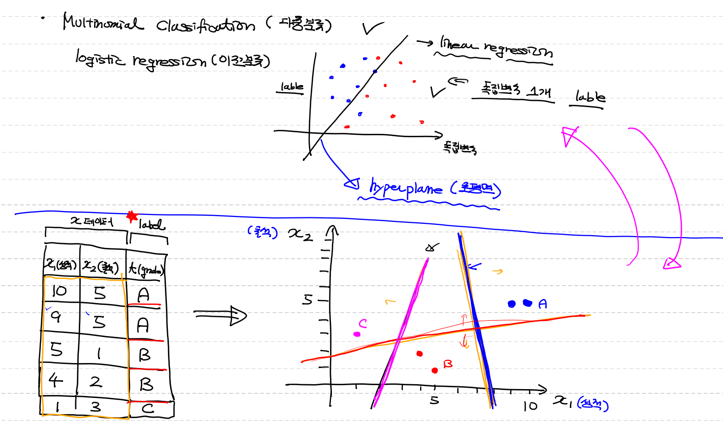 독립변수 여러개 →독립변수에 갯수에 따라 hyperplane(초평면)이 변하는데