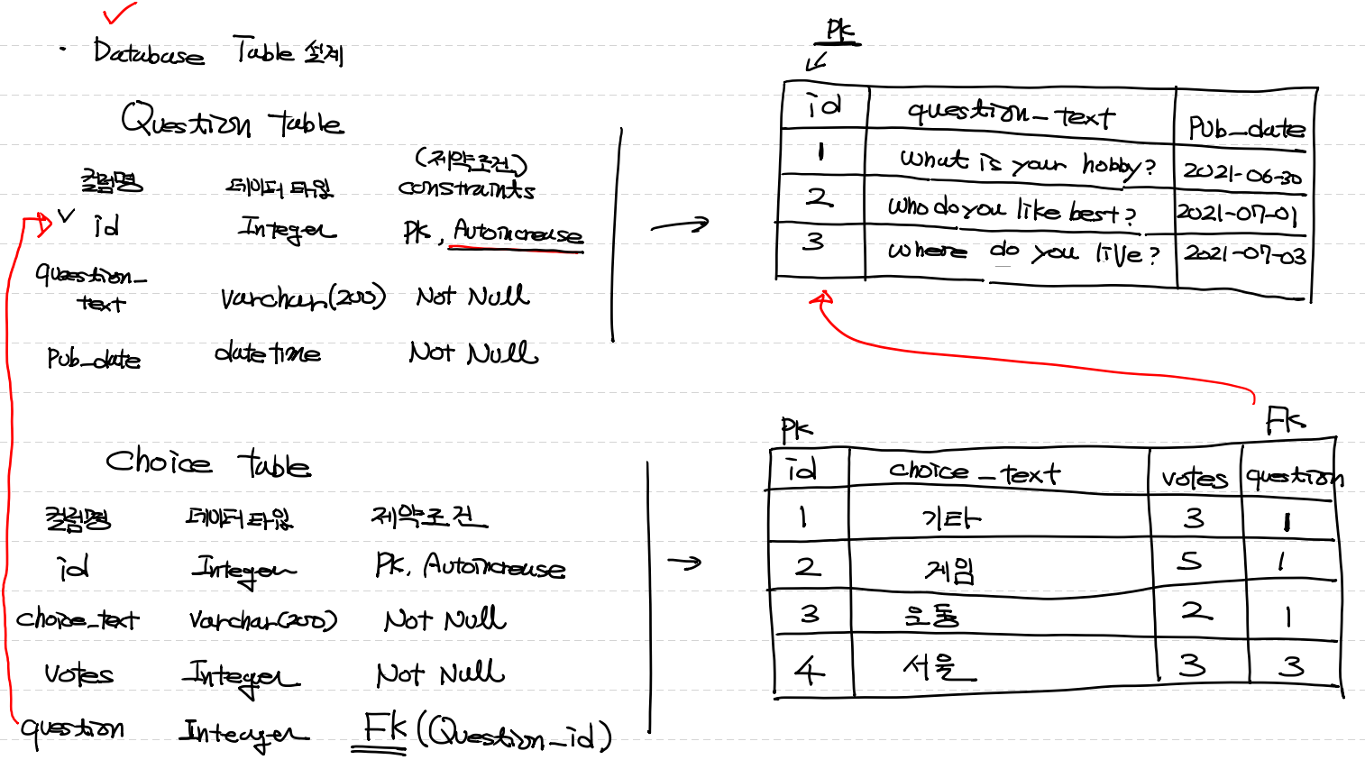 #foreignkey(외래키는 두 테이블을 서로 연결하는 데 사용되는 키)는 컬럼명이 될 때 현재 명시한 class variable의 이름에 + '_id' 붙여서 컬럼명이 된다!